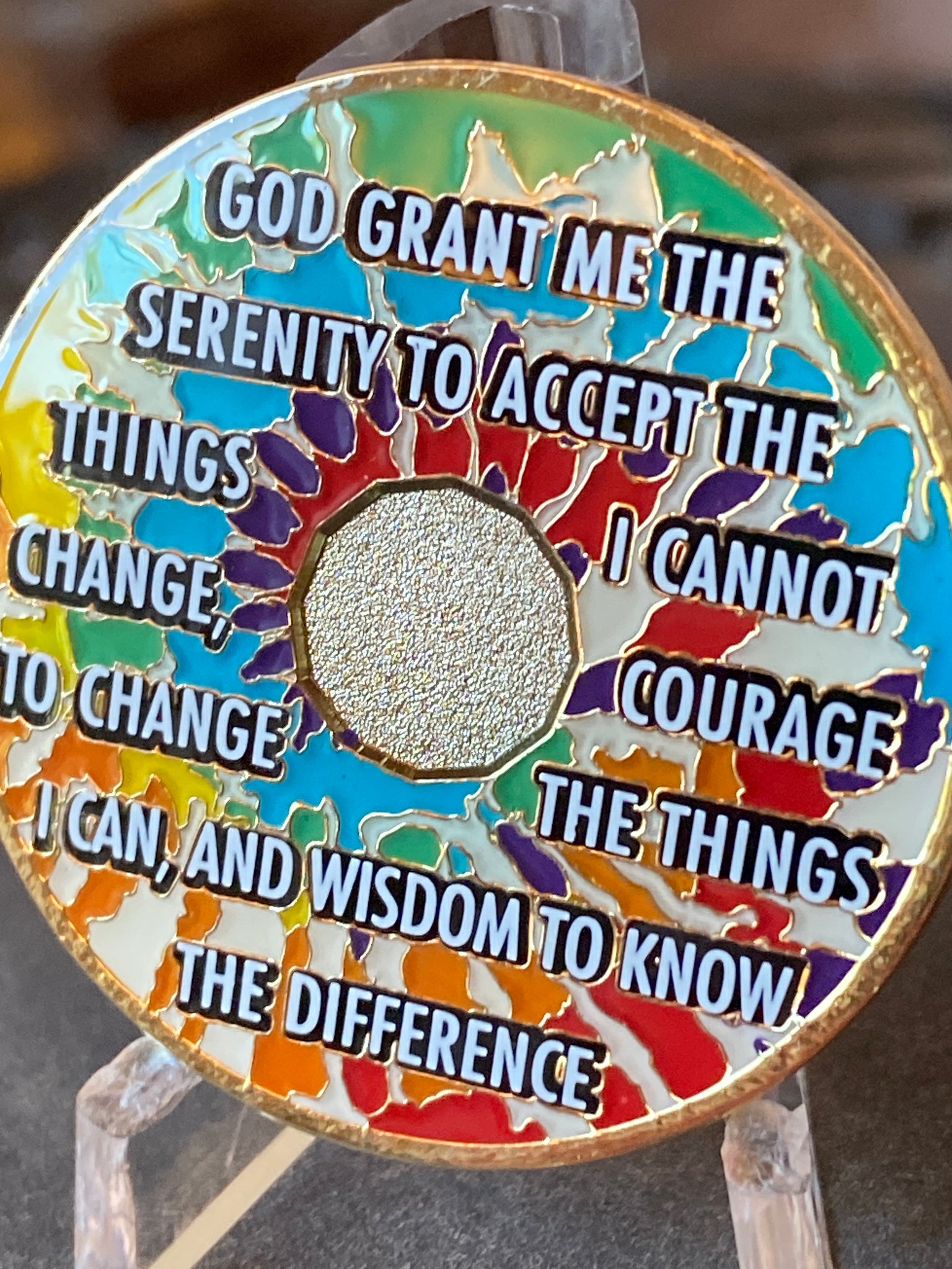 Celebrate 4 year of sobriety with this distinctive AA medallion featuring vibrant hippie tie-dye design. The front showcases traditional recovery symbolism, while the reverse displays the Serenity Prayer—a cornerstone of 12-step programs. Crafted with attention to detail, this chip serves as a meaningful token of commitment and personal transformation. Perfect for commemorating a significant milestone in your recovery journey, it's a tangible reminder of strength, resilience, and the spiritual principles that guide sustained sobriety. An ideal keepsake for yourself or a thoughtful gift for someone celebrating this important achievement.