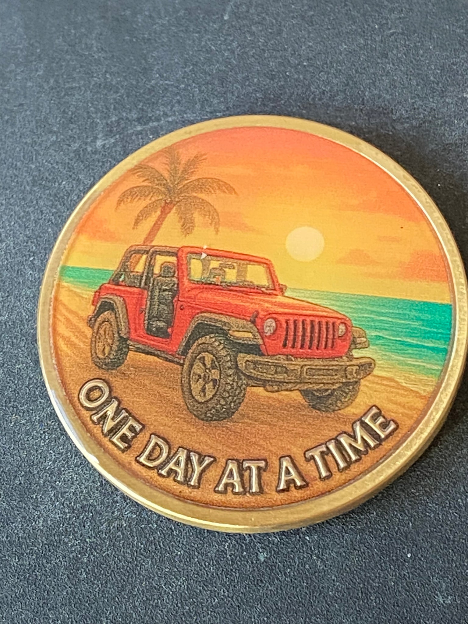 This medallion coin features a detailed design of a red Jeep on a beach beside a palm tree and a duck, symbolizing serenity and calm. Inscribed with the "One Day At A Time" Serenity Prayer, it serves as a meaningful reminder to stay grounded and present. Crafted for durability, this coin is ideal for personal reflection or as a supportive gift for those embracing recovery and mindfulness. Glass like epoxy dome. 34x3mm Size.