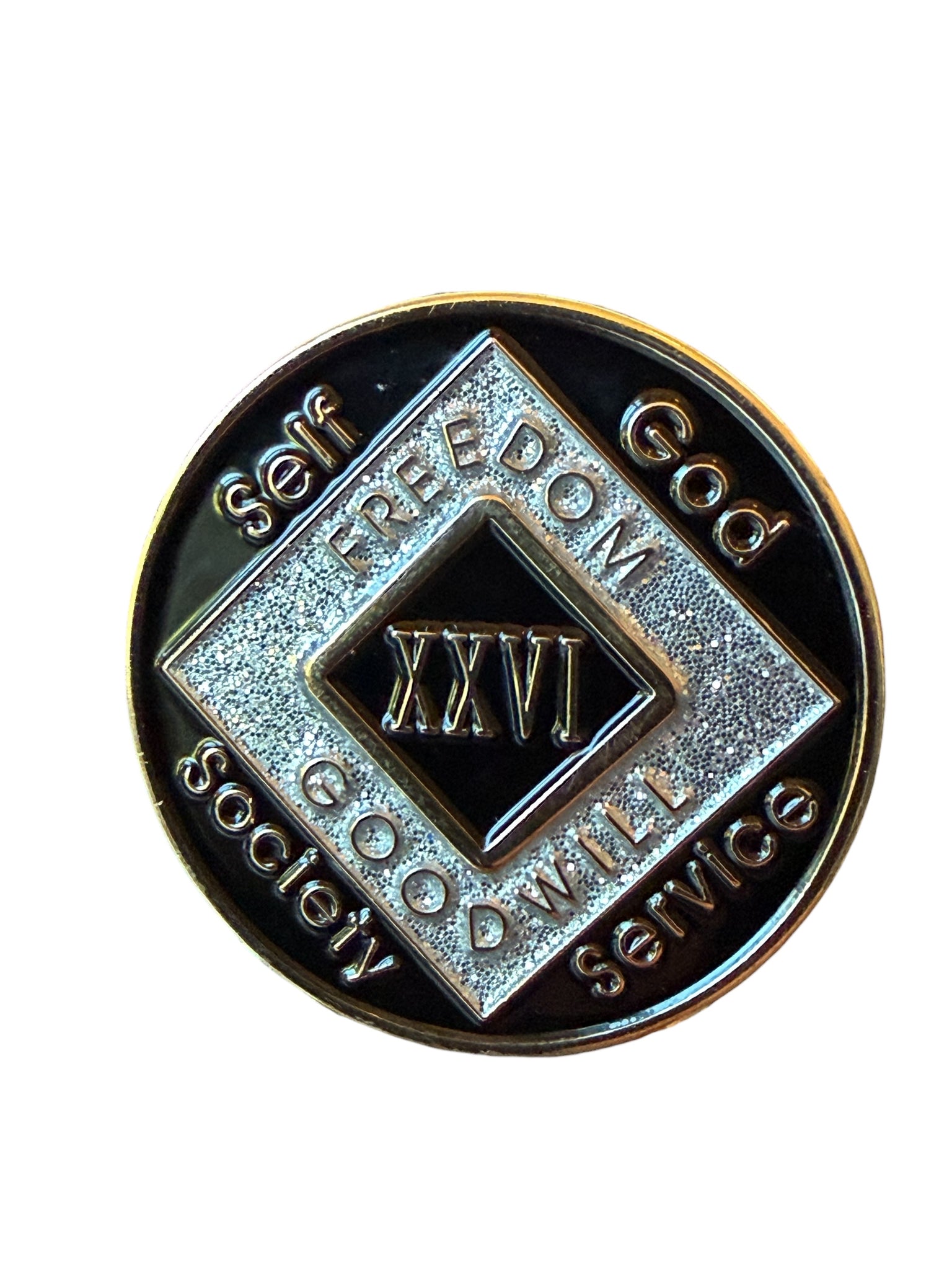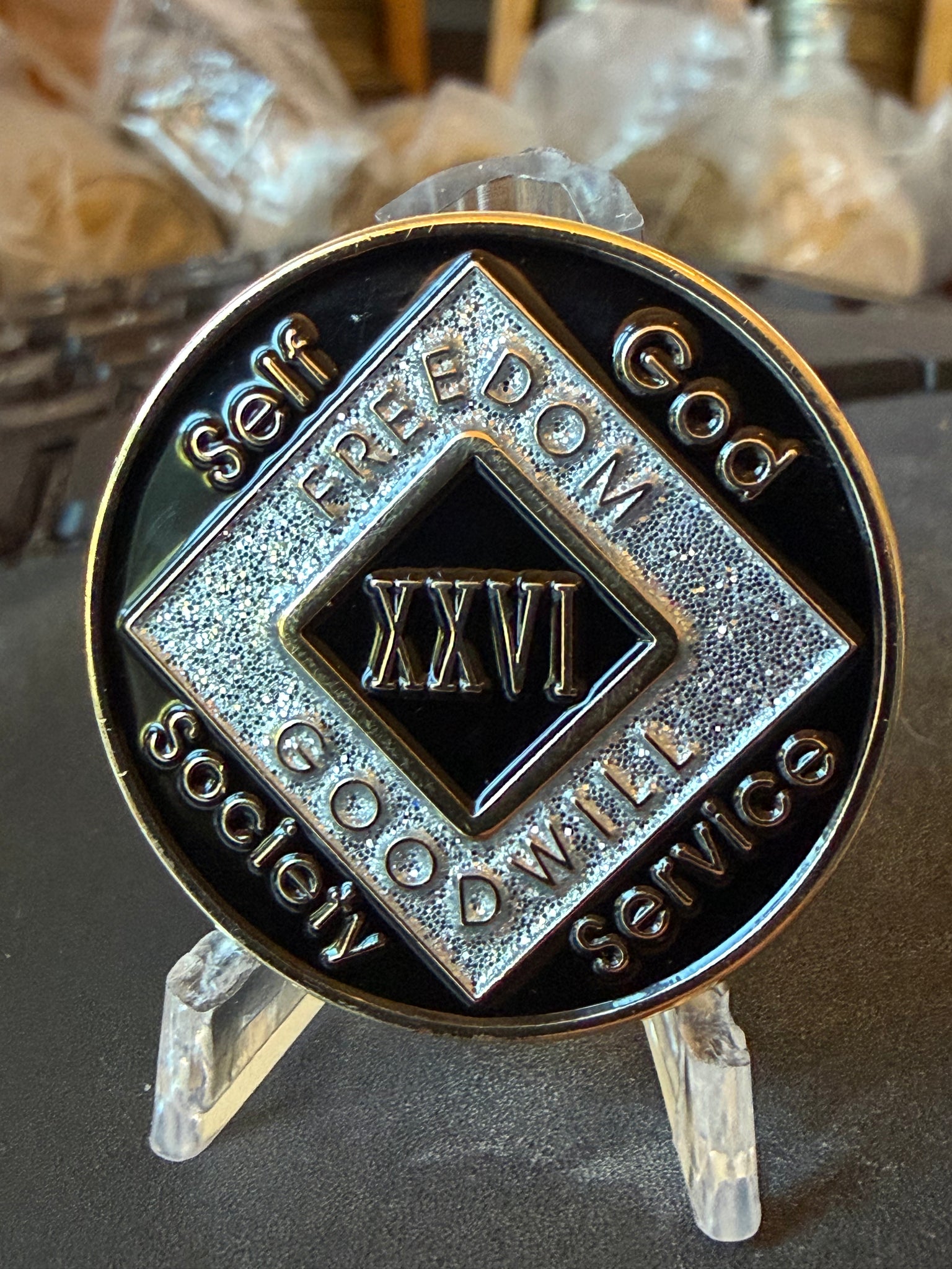 The 26 Year NA Clean Time Chip is crafted to commemorate significant milestones in recovery. Measuring 34x2mm, this medallion features a distinguished black finish with silver glitter accents, symbolizing resilience and commitment to sobriety. It serves as a tangible reminder of a 26-year commitment to a drug-free life.