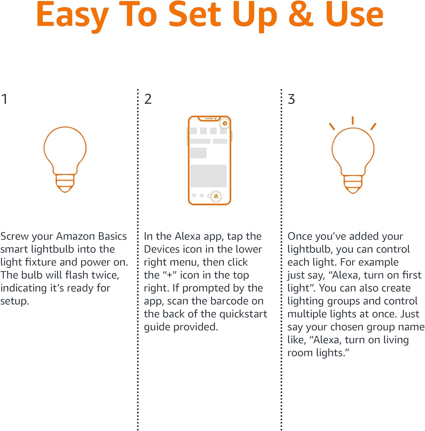 Amazon Basics Smart A19 LED Light Bulb, Dimmable Soft White (2700K), 9W (60W Equivalent), 800LM, Works with Alexa Only, 2.4 GHz Wi-Fi, No Hub Required