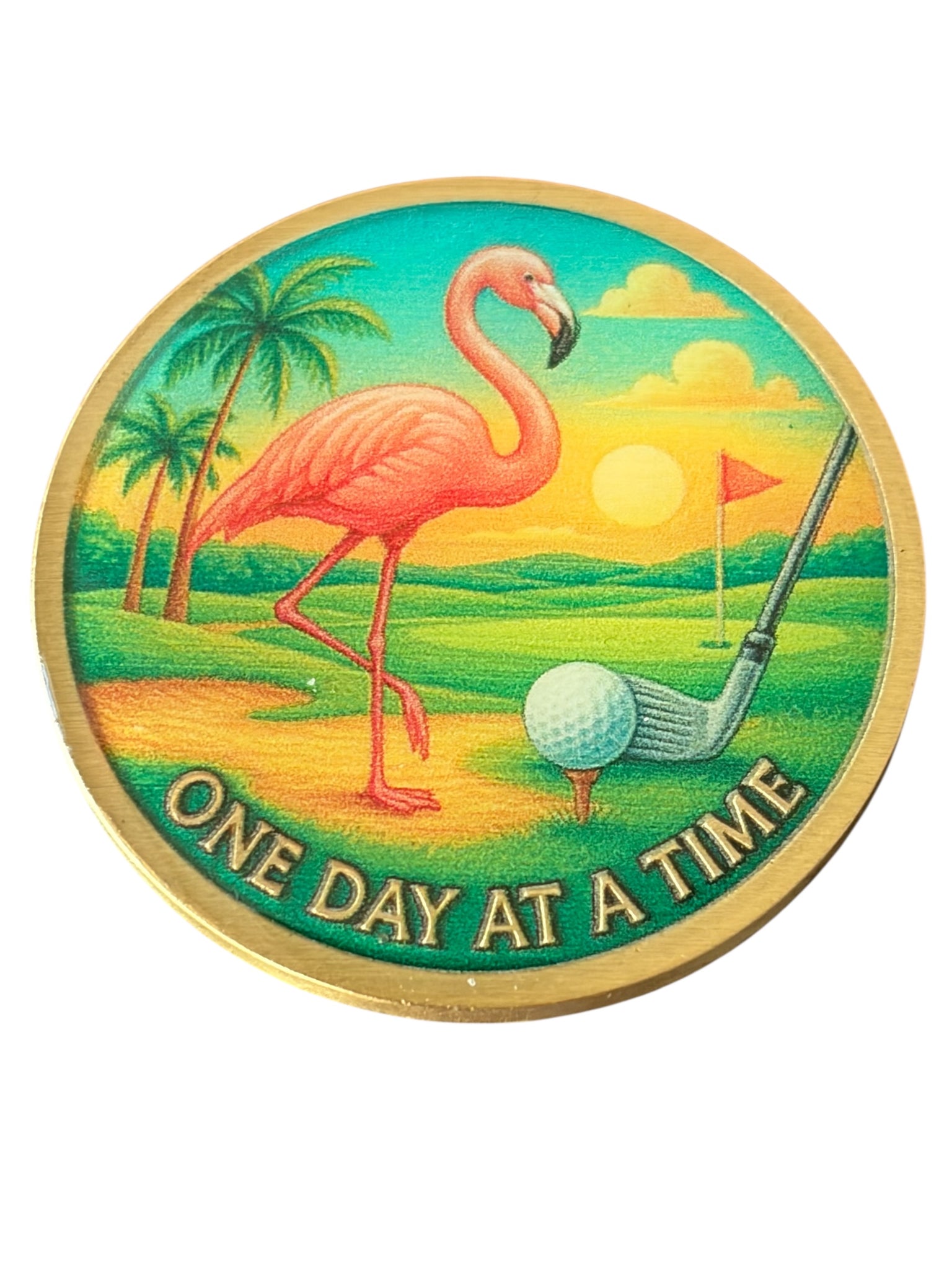 This beautifully detailed coin features a striking pink flamingo standing on a tropical golf course at sunset, symbolizing balance, patience, and forward movement. The warm sunset tones and palm trees create a peaceful reminder to focus on today — just like your recovery.