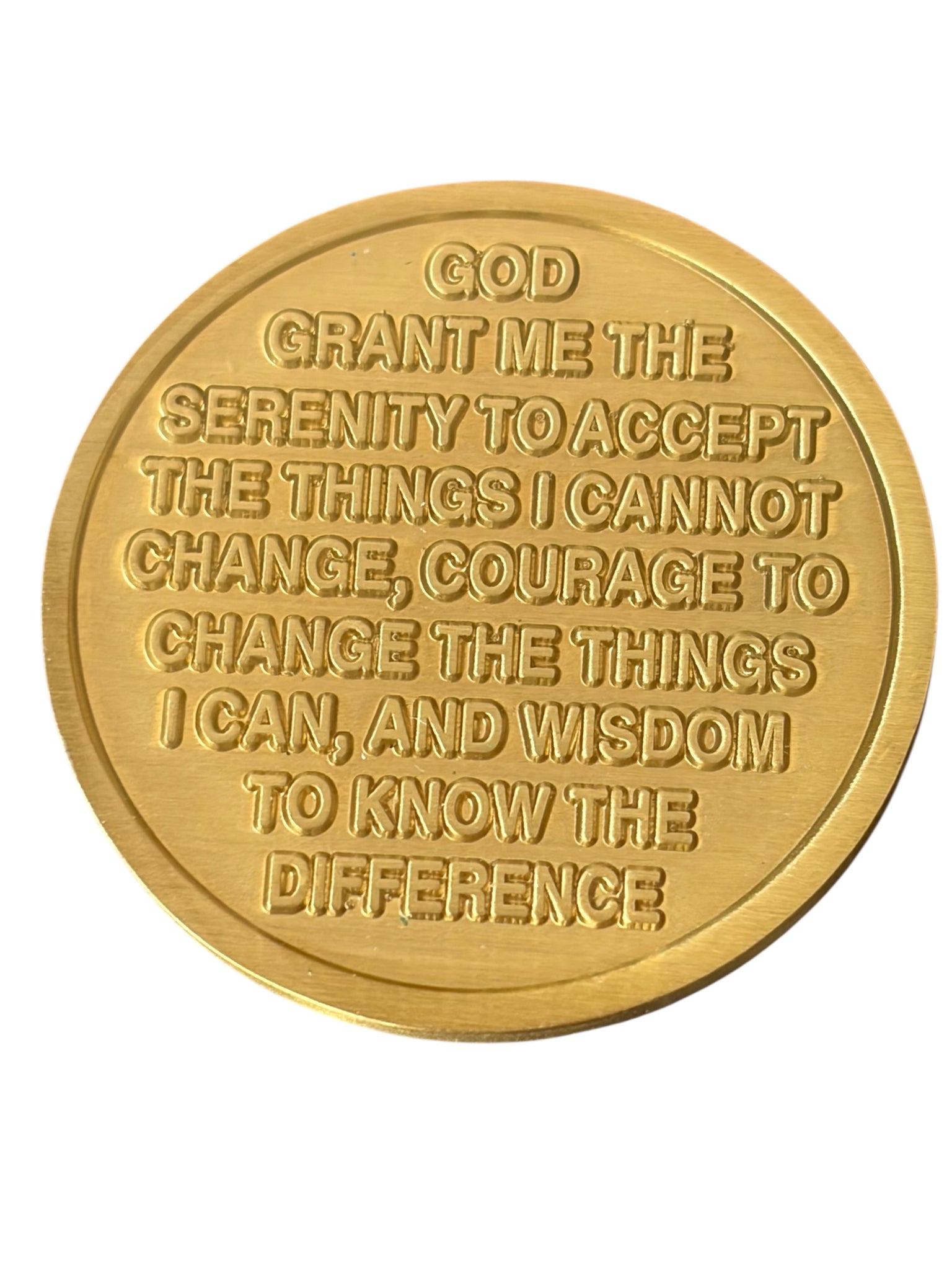 The reverse side features the full Serenity Prayer, deeply engraved for a bold, easy-to-read finish: