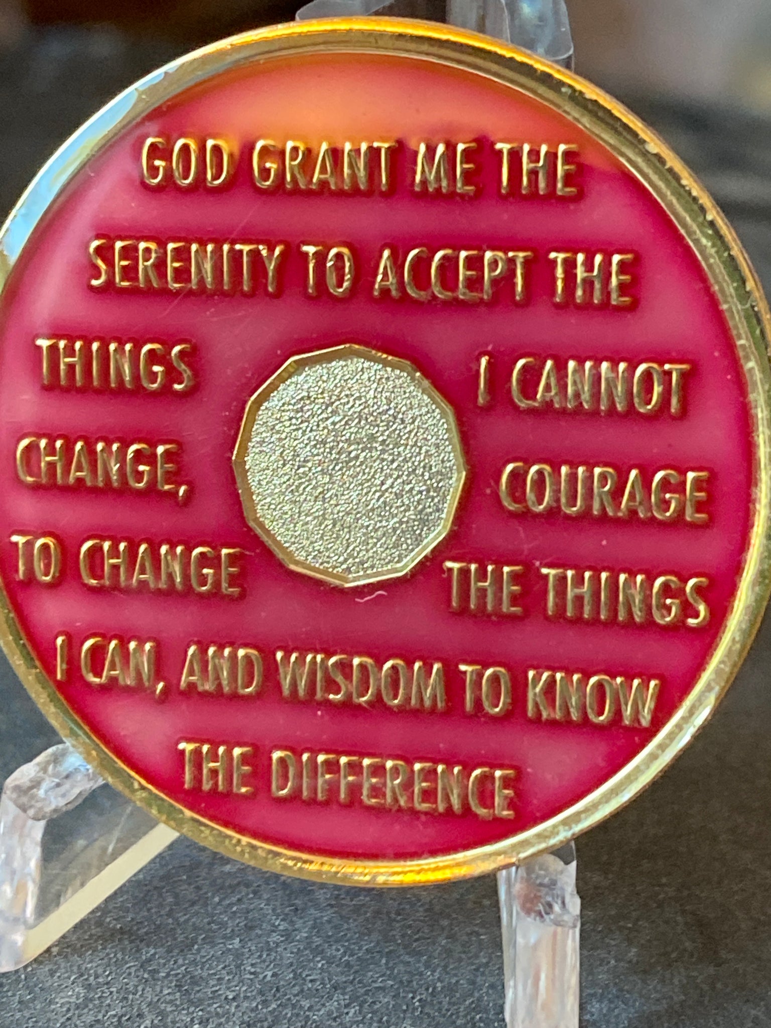 Mark the beginning of your recovery journey with this 24-hour AA medallion, crafted to commemorate your first day of sobriety. Featuring a tri-plate pink finish, this durable chip displays the iconic AA symbol on the front while the reverse side bears the Serenity Prayer—a cornerstone of 12-step recovery. Designed for those taking their initial step toward lasting change, this medallion serves as a tangible reminder of commitment and hope during the critical early stages of recovery.