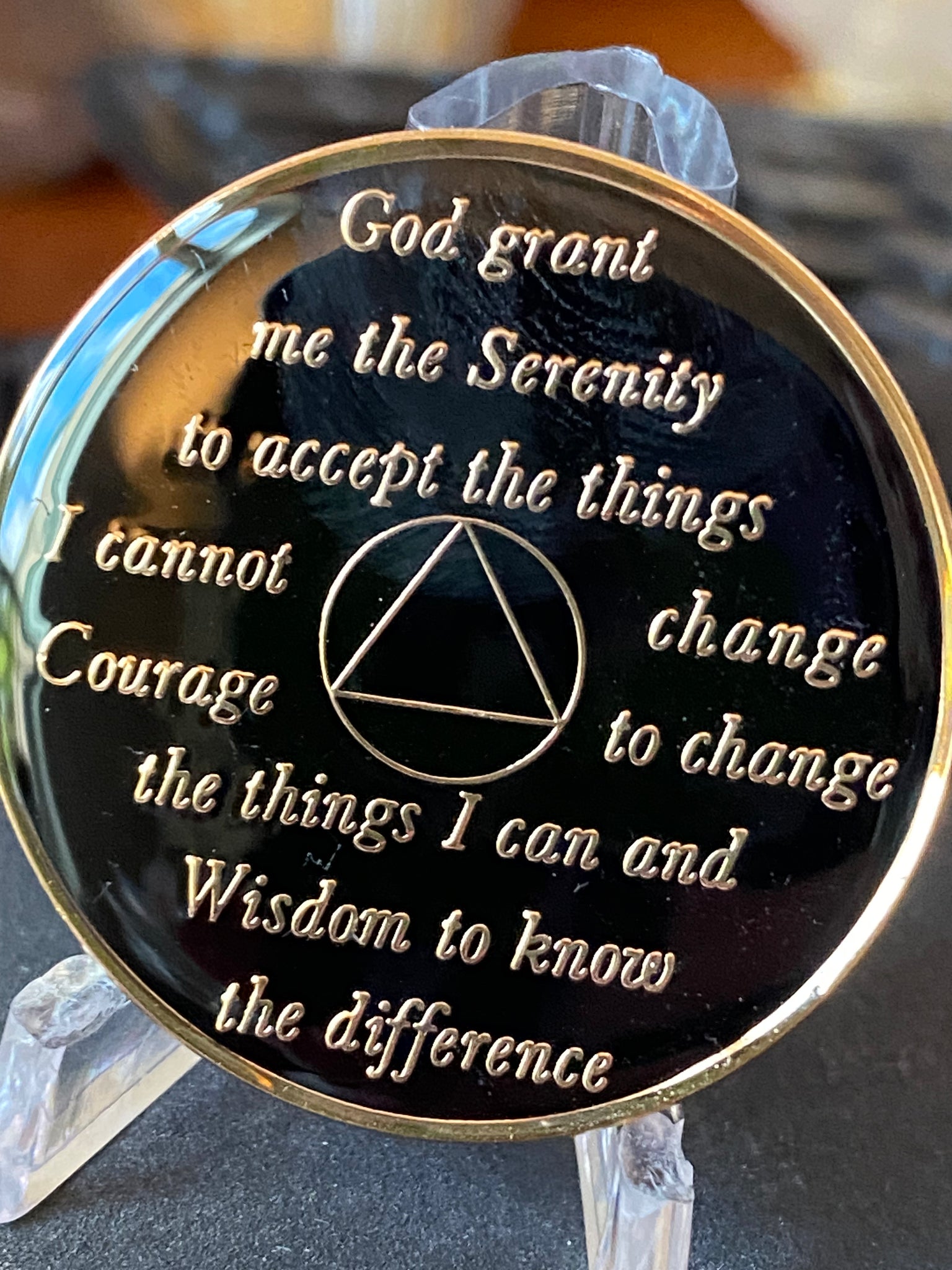 Commemorate 45 years of continuous sobriety with this premium AA medallion, crafted with a glossy black tri-plate finish that resists tarnishing and maintains its lustrous appearance. The reverse side features the Serenity Prayer, offering daily inspiration and spiritual grounding. This substantial token serves anyone giving a sobriety gift well. Glass like epoxy dome