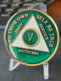 5 Year AA Medallion Metallic Green Tri-Plate Sobriety Chip Serenity Prayer Back