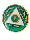 Recognize and celebrate 5 years of sobriety with this metallic green tri-plate medallion. Featuring the Serenity Prayer on the back, this chip serves as a reminder of your journey and your dedication to recovery. Made with high-quality materials and precision, this medallion is a symbol of strength and perseverance.