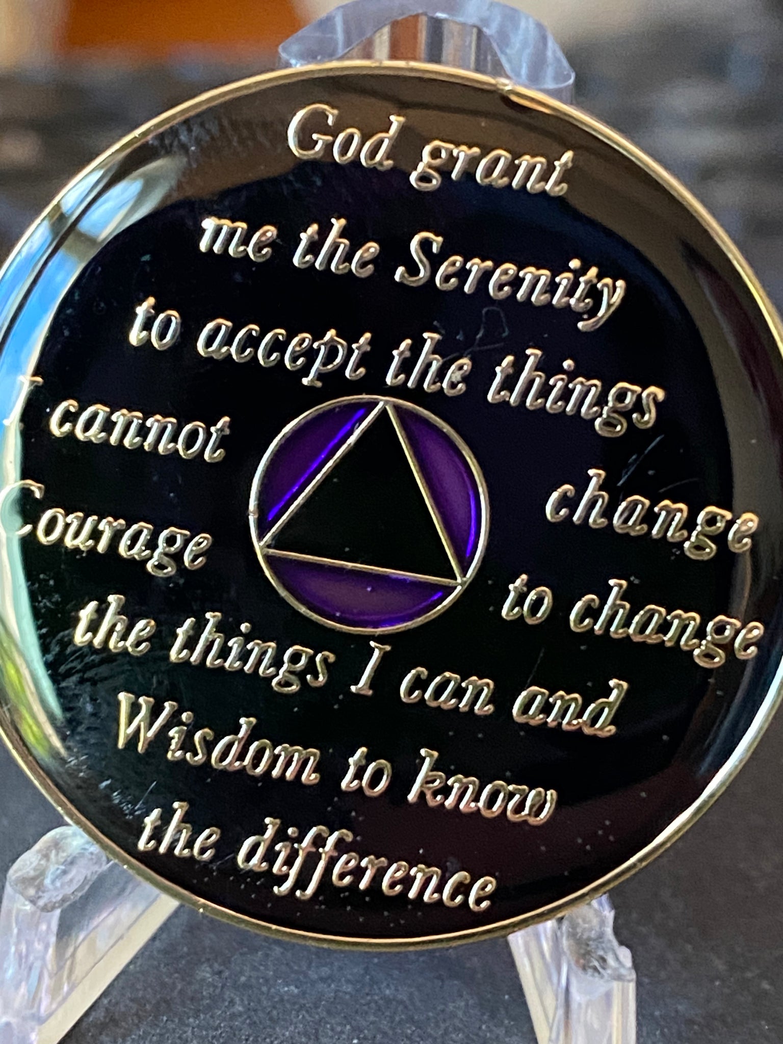 Commemorate 23 years of continuous sobriety with this premium AA medallion, crafted with a glossy Purple tri-plate finish that resists tarnishing and maintains its lustrous appearance. The reverse side features the Serenity Prayer, offering daily inspiration and spiritual grounding. This substantial token serves anyone giving a sobriety gift well.  Glass like epoxy dome